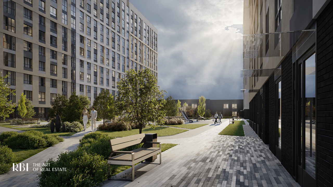 Это не просто двор — это живописное полотно под открытым небом. Настоящий ручей, пейзажный парк и мягкие линии ландшафта — здесь природа становится частью повседневности. Приватность охраняемой территории обеспечена её расположением на уровне 2-го этажа на стилобате. Попасть сюда можно только по ключу — или по приглашению, как в закрытую галерею для ценителей тишины и красоты. Во дворе вы словно вы поднимаетесь над городской суетой к покою и свету.